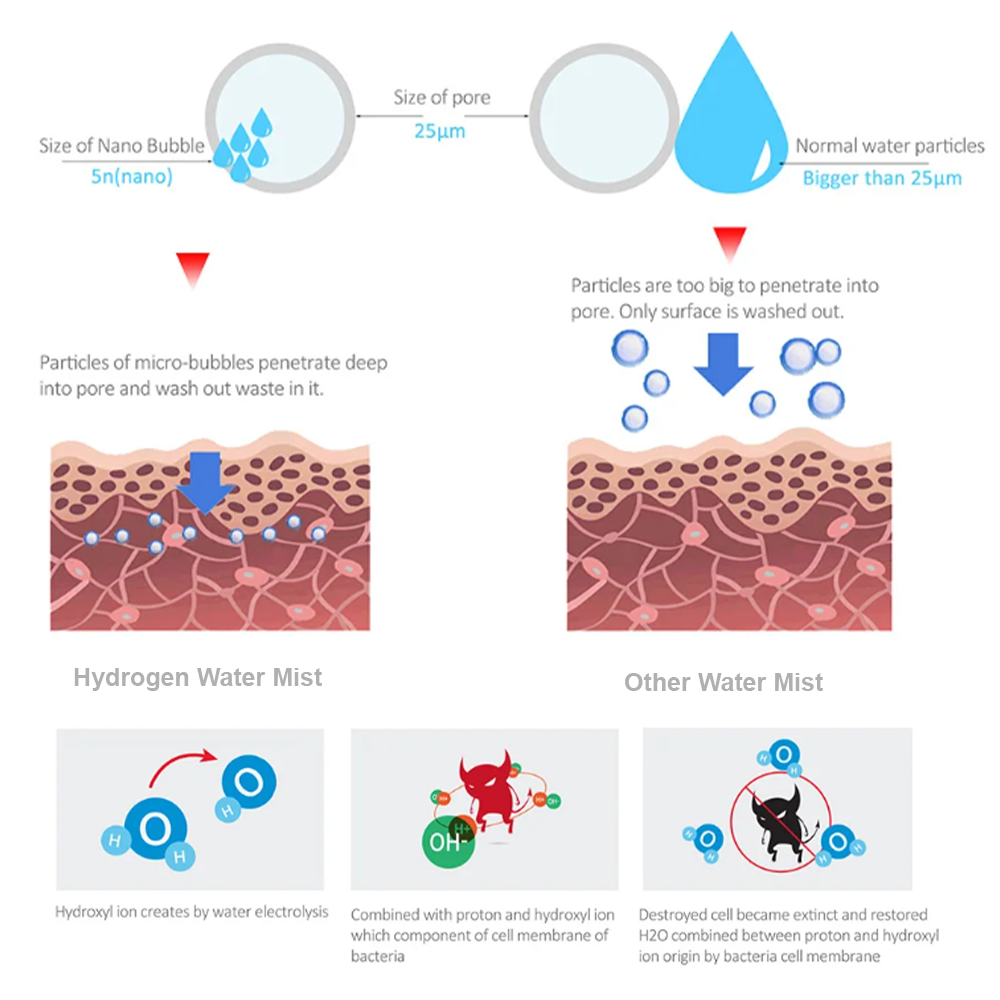 • Progrès en matière de microparticules : Les bulles d'hydrogène de taille nanométrique présentes dans la brume nettoient et hydratent la peau en profondeur en pénétrant les pores plus efficacement que les particules d'eau ordinaires.