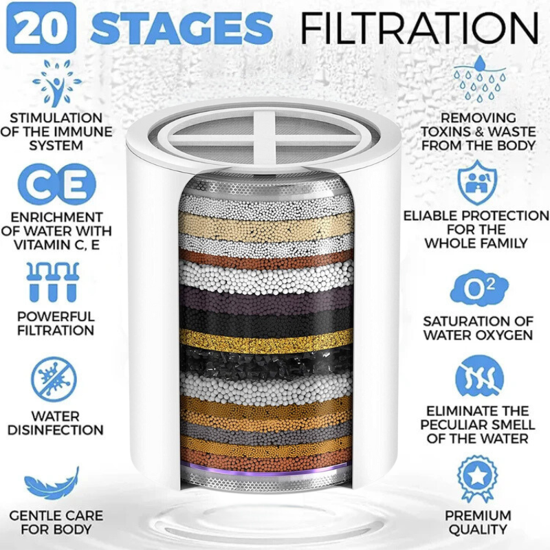 - Le Filtre de remplacement de la pomme de douche à 20 étapes dispose d'un Processus de filtration en 20 étapes qui élimine toutes les impuretés de l'eau de votre douche, y compris le chlore, la rouille, les bactéries, le calcaire, le sable, les métaux lourds et la saleté.